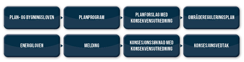 Når konsekvensutredningen er gjennomført sendes det inn søknad om konsesjon og forslag til områderegulering. Når myndighetene har den informasjonen de trenger, vil det treffes et vedtak. Kommunen vedtar en områdereguleringsplan og NVE vil gi en anleggskonsesjon for prosjektet, som er en tillatelse til bygging og drift av anlegget. Tillatelsene kan på-klages av alle med rettslig klageinteresse i saken. Ved en klage vil saken behandles på nytt av klageinstansen. Før bygging kreves det også at utbygger må lage en detaljplan for bygging av anlegget, som skal vise hvordan miljø- og landskap skal ivaretas på best mulig måte i anleggsfasen.